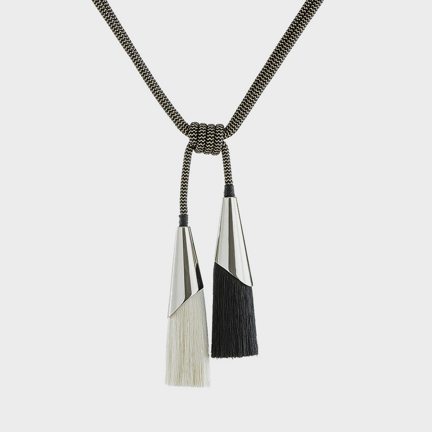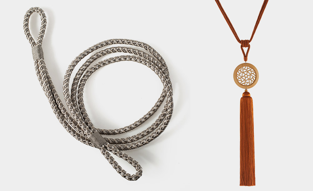 將蠟繩原料制作出仿皮效果后,交織成一根肌理清晰的粗繩,配上亞光的金屬接頭,呈現出硬朗與簡約。
