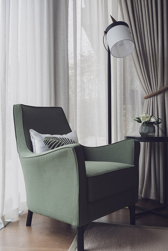 雖然只是一條綁窗簾的系帶,卻讓窗簾呈現弧線的造型而不是直挺挺的垂直,并且是目光焦點,風格與品質就在這一處點睛。